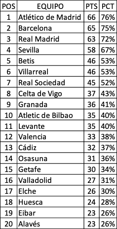 A partir del octavo lugar, que es ocupado por el Celta de Vigo con 37 puntos, ya no cuentan con ninguna posibilidad de levantar el título.