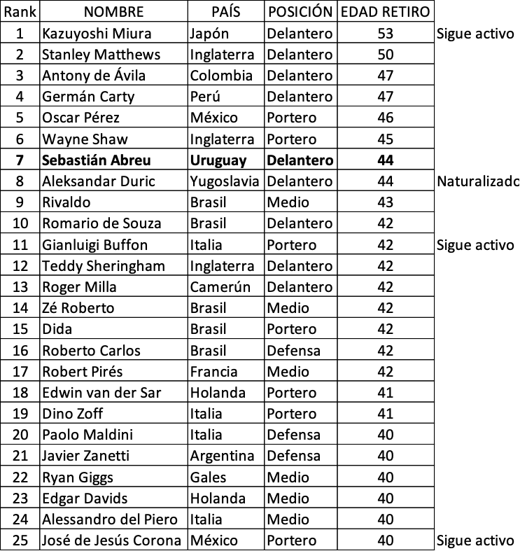 A pesar de haberse retirado a los 44 años, Abreu no ha sido el futbolista más longevo, pero forma parte de un grupo extraordinario de jugadores que han jugado con más de 40 años: