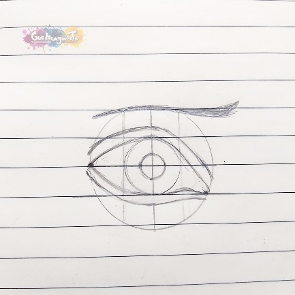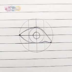 - Contorneamos el círculo central. Con líneas simples, empezaremos a dar forma al ojo (buzos con los puntos que coloqué en los extremos del círculo, porque estos nos servirán de guía).