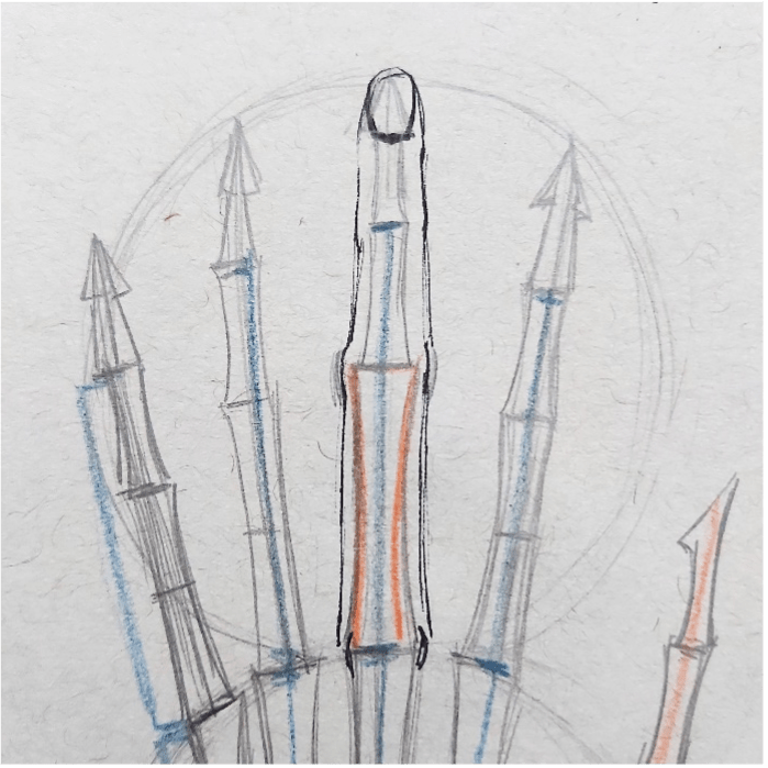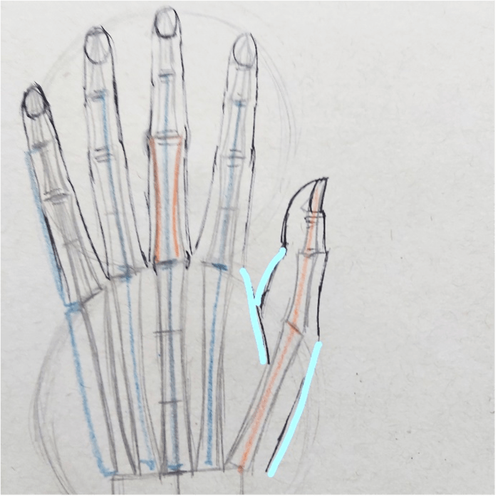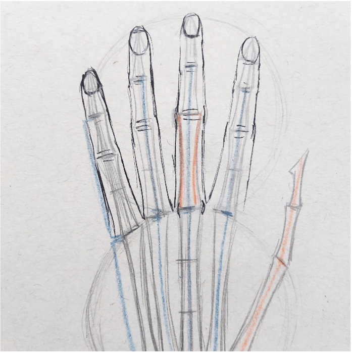 - Contornea. Una vez identificadas todas las articulaciones, vamos a contornear los dedos siguiendo y respetando las curvaturas generadas por la forma de los huesos.