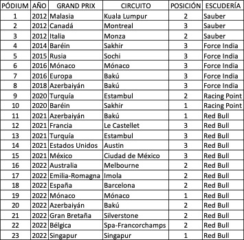 Checo ha logrado ya 23 pódiums en su carrera en la Fórmula 1, a continuación repasaremos cada uno de ellos: